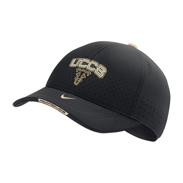 Nike Sideline Hat L91 adjustable. Nike Legacy91 adjustable hat constructed in Dri-Fit Bozz fabric. Zone perforation is placed strategically throughout the crown to wick moisture away and keep the wearer cool. Aerobill construction for added comfort. One-hand quick adjust Velcro closure with Swoosh & authentic on-field ID silicone pull tab. Added elastic for a customized fit. HD embroidered UCCS Mascot logo at center front paired with Swoosh design trademark on top of visor for added visibility. Contrast sandwich woven label with Mountain Lions.