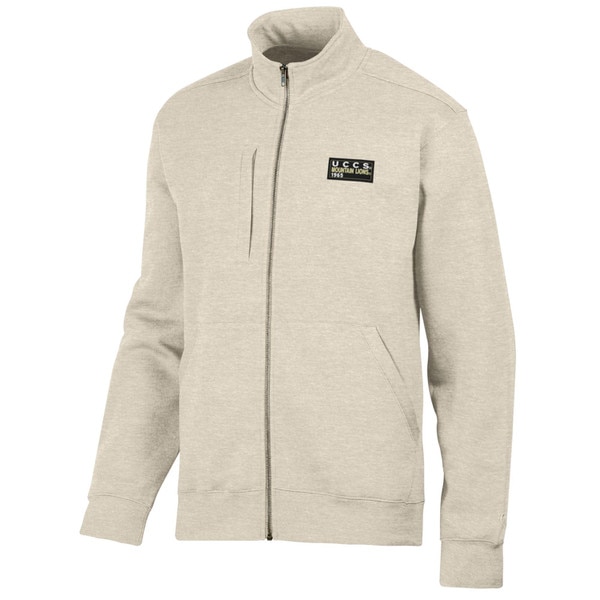 UCCS Gear Big Cotton Aidan Jacket by Gear for Sports. 75% cotton, 25% polyester, 9oz fleece. 1x1 cotton/spandex rib at inner collar, cuff, and waistband. Outerwear styling influence shown in back yoke, rolled forward shoulder. Upper right pocket welt and half-kanga pockets. Classic fit. Embroidered UCCS logos.