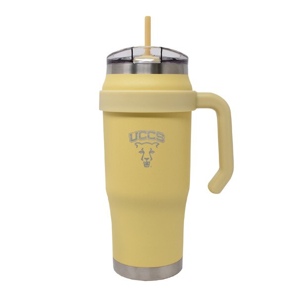 UCCS Mybevi Outlander Mug in Butter. 32oz. superior grade stainless steel, BPA free materials. Vacuum insulation. Cold 24 hours, hot 12 hours. Cup holder friendly and carry handle. Sweat proof and splash resistant. Thread on/off lid, with dual use straw hole opening and sip through drink hole. Includes straw. Engraved UCCS logo.