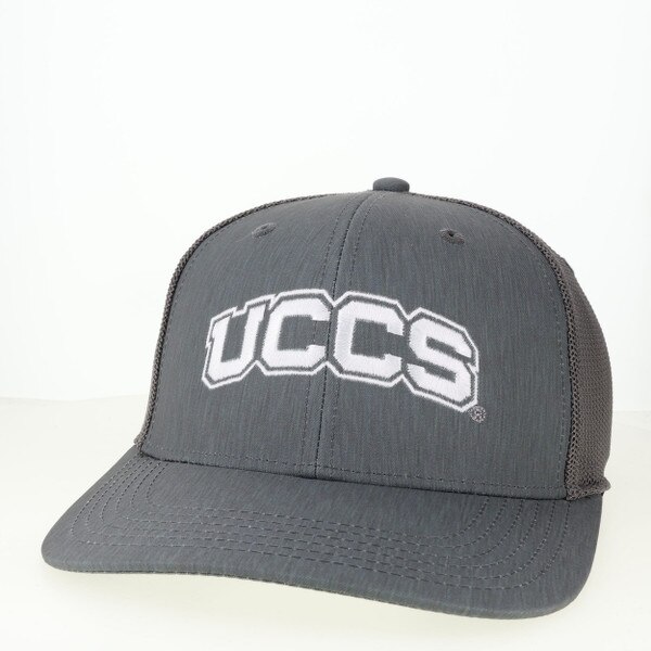 UCCS Reclaim Stretch Fit Hat in Dark Grey by Legacy. Features a mid-profile structured crown, slightly curved visor and closed back stretch fit. Moisture-wicking sweatband. Designed using recycled polyester-based yarns in partnership with REPREVE. Sizes S/M and L/XL. Flat embroidered UCCS logo.