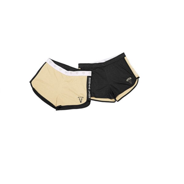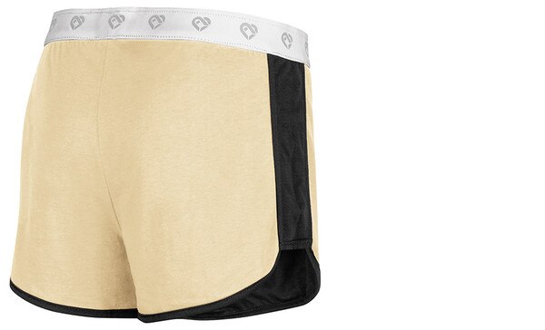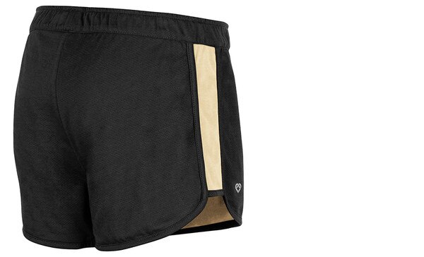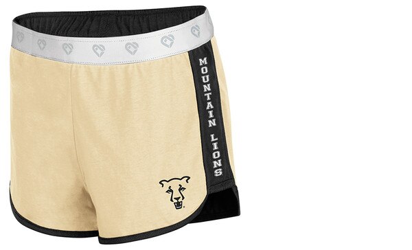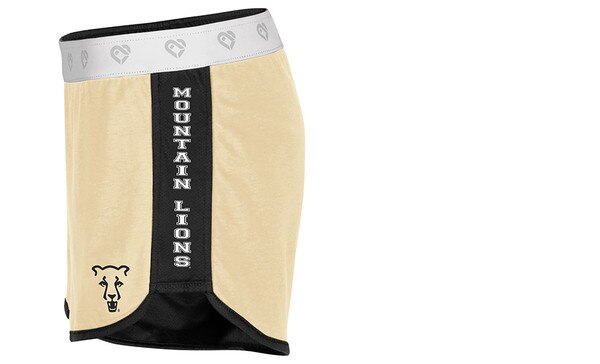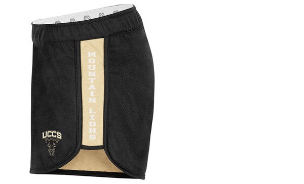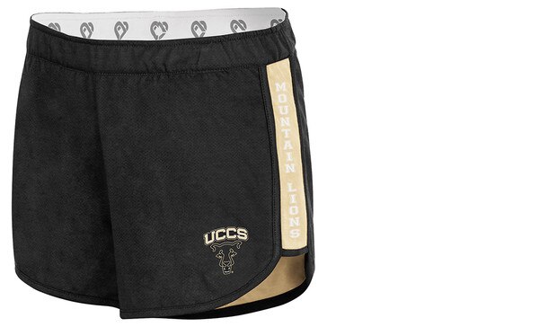 Athletic fit. white colosseum branded elastic waistband. Contrast side inserts. Black and Vegas Gold team color self-binding. Reversible construction. 3" inseam. UCCS logos screen-printed on both sides. Outer: 85% Polyester/15% Cotton. Inner: 60% Cotton/40% Polyester.